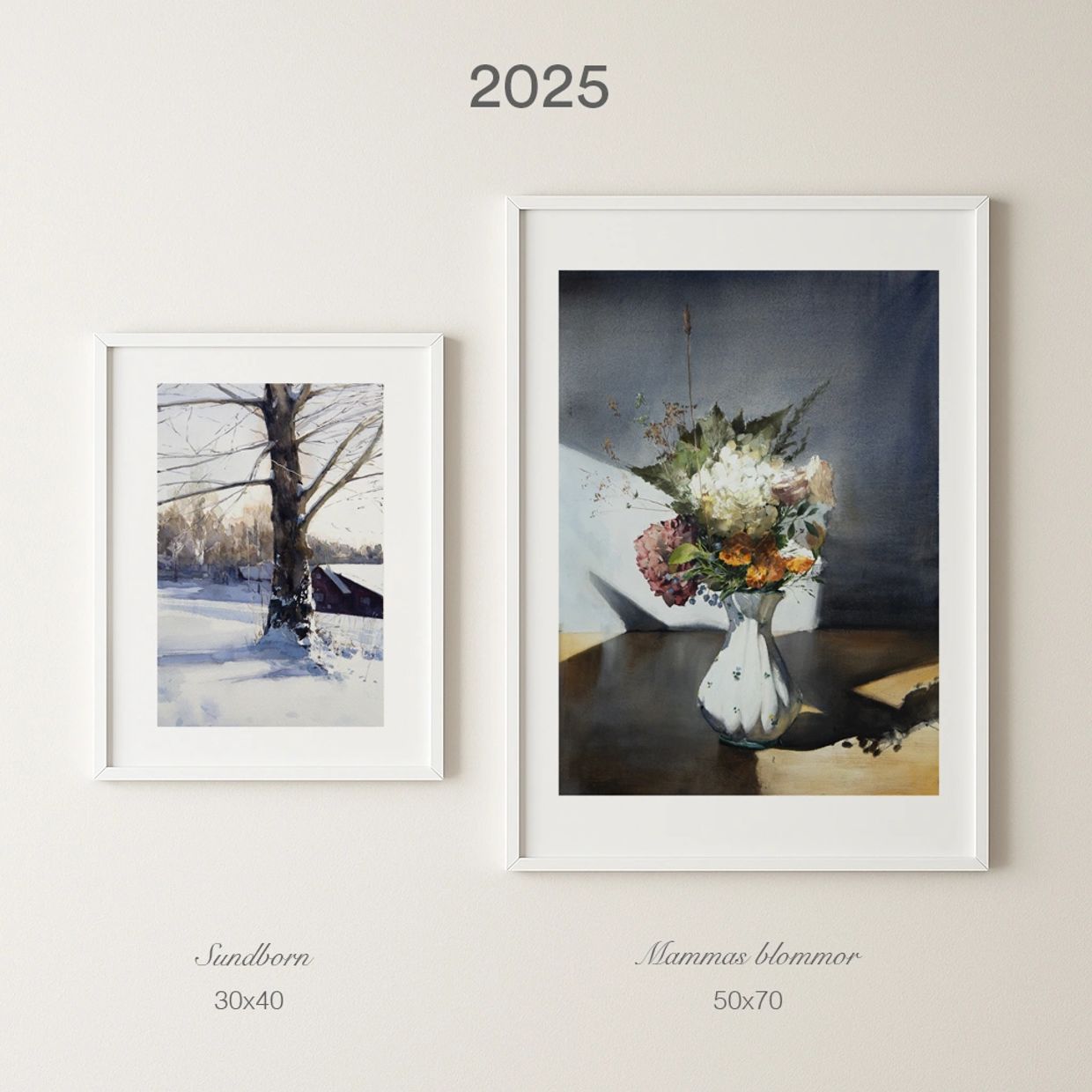 När jag besökte Falun och Sundborn, som var fantastiskt vackert och inspirerande, målade jag några motiv. Något i just det här motivet får mig att tänka på dagen vi var där och allt vi såg. Därför valde jag just trädet som min vinterprint.